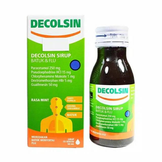 DECOLSIN SIRUP mengandung zat aktif Paracetamol, Guaiphenesin, Phenylpropanolamine, Ethylephedrine, Chlorpheniramine maleat, dan Dextromethorphan HBr. Obat ini digunakan untuk mengatasi gejala flu seperti demam, sakit kepala, bersin-bersin dan hidung tersumbat yang disertai batuk. Obat ini dapat menyebabkan kantuk. Jangan mengendarai kendaraan bermotor atau menjalankan mesin.