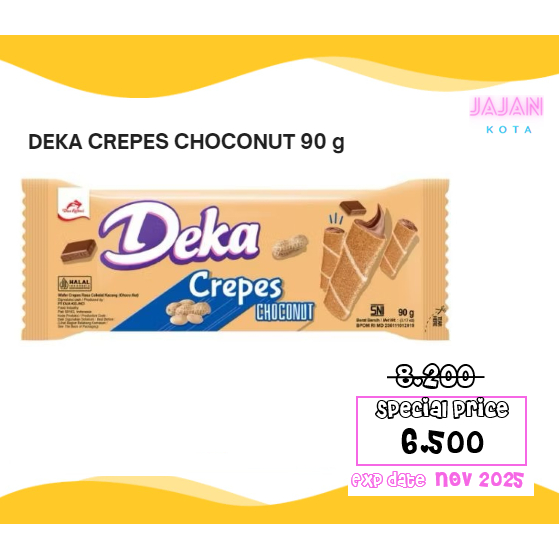 Deka Crepes - Choco Nut (Family Pack) Deka Crepes Choco Nut, adalah wafer lipat pertama di Indonesia, dengan krim lembut, yang dibalut dengan wafer renyah serta Kombinasi rasa Coklat dan Kacang yang enak. Praktis, dan Cocok untuk dinikmati dalam setiap aktifitas.