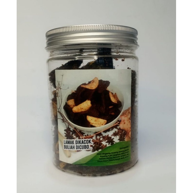 dendeng daun ubi bumbu rendang terbuat dari bahan alami seperti daun ubi segar serta bumbu bumvu rempah rempsh nusantara yg di olsh secara tradisional , tampa bahan pengawet dan pewarna buatan