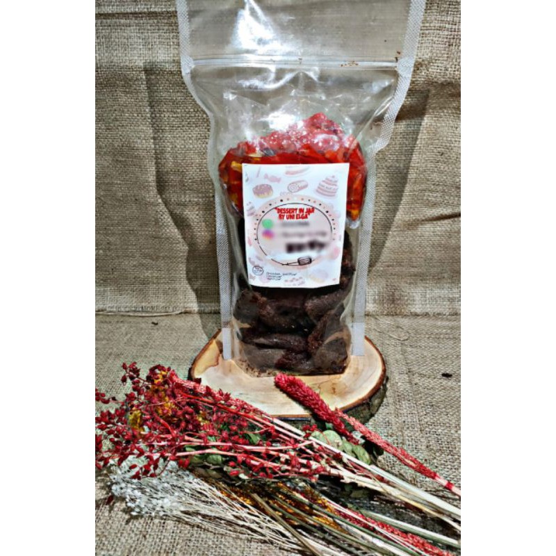 Dendeng kering balado tekstur dagingnya sangat kering dan crispy! Terbuat dari 100% pure daging sapi pilihan dicampur dengan bumbu & rempah" pilihan sehingga cita rasa dari daging dendeng keringnya sangat gurih.