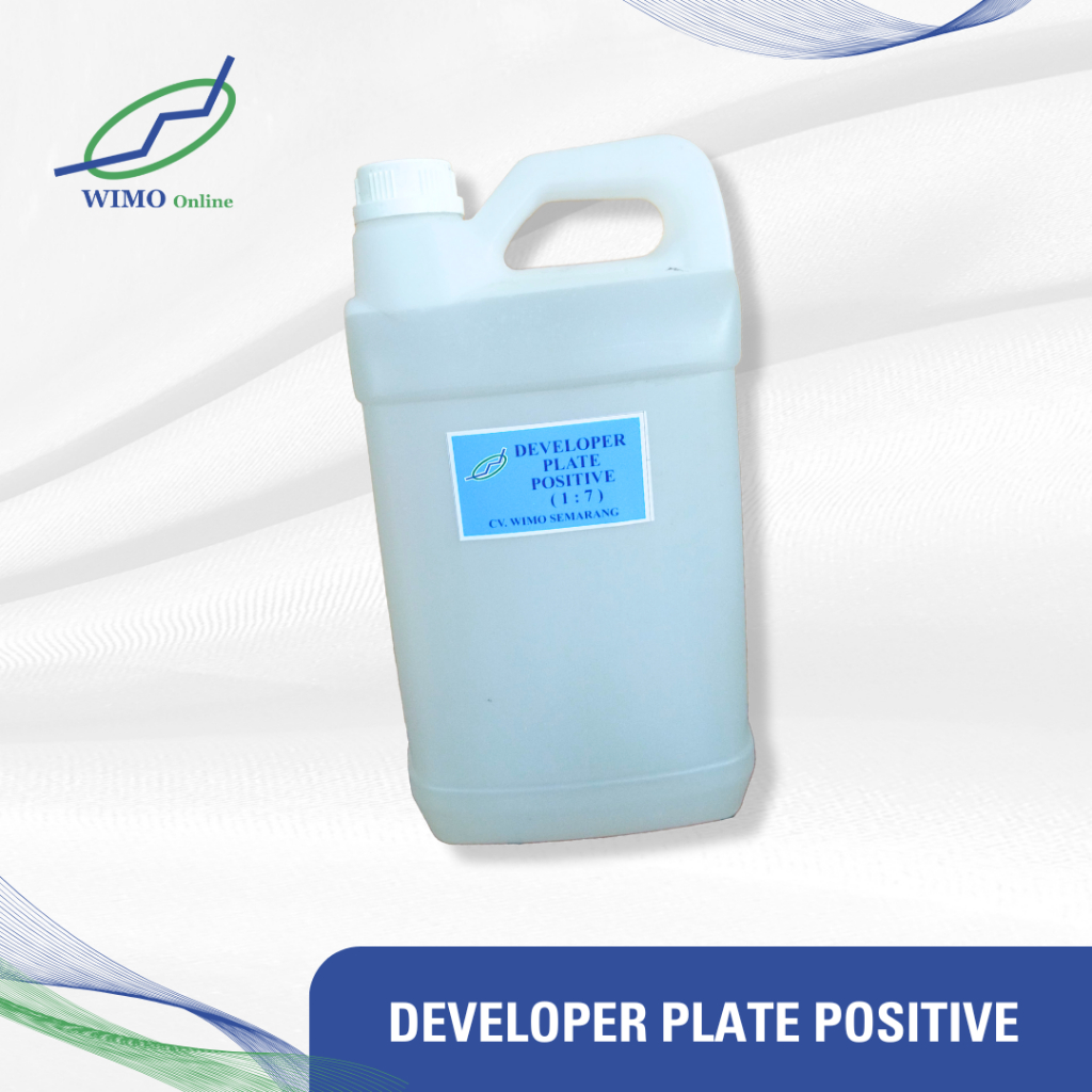 Developer Plate WIMO, pemakaiannya irit dan ekonomis dengan perbandingan { 1 : 6 s/d 1 : 7 } Cocok untuk semua jenis plate positive, untuk pemakaian secara manual atau dengan mesin Prossesor Plate Otomatis.