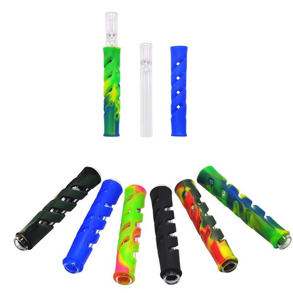 DHL wholesale Potable Glass FDA Silicone One Hitter Tobacco Smoking pipe Hose 90MM Cigarette Holder Dugout Pipe Tobacco Herb Pipes