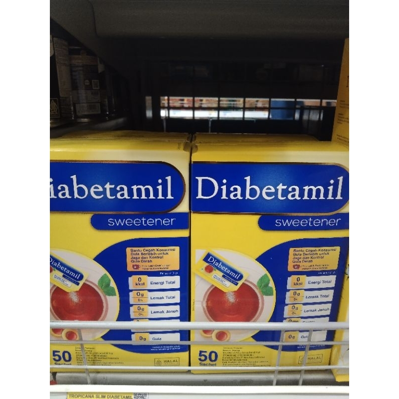 Diabetamil Sweetener 50 gr dikemas dalam box berisi 50 sachet.