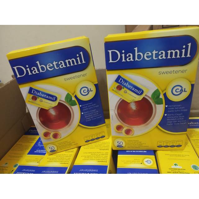 Diabetamil Sweetener 50x1gDiabetamil Sweetener 50x1g tidak mengandung kalori dan tidak mempengaruhi rasa manis pada minuman panas seperti teh atau kopi, karena kestabilannya pada suhu tinggi. Selain itu, produk Diabetamil sweetener dari Kalbe ini tidak menimbulkan after taste pahit di lidah. Produk ini juga baik untuk menjaga kadar gula darah, serta untuk membatasi konsumsi gula. Tujuannya: untuk mencegah diabetes, mengontrol asupan kalori, serta menjaga agar badan tetap ideal. Bagi Anda yang tak ingin kehilangan momen menikmati minuman panas manis kesukaan meski sedang diet, mulai beralihlah dengan Diabetamil Sweetener 50x1g.