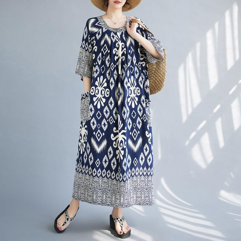 DIMANAF Женское платье больших размеров, новинка 2024 года, летнее хлопковое платье, винтажное платье с круглым вырезом, базовые свободные длинные платья большого размера One Size темно-синий