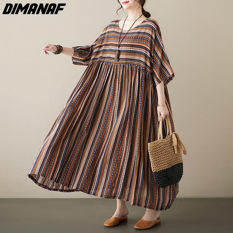 DIMANAF Женское платье больших размеров 2023, новое летнее стильное свободное платье, базовые синие платья в полоску, большие размеры one size коричневый