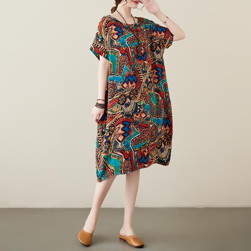 DIMANAF Женское платье больших размеров 2024, новое летнее стильное платье с круглым вырезом и цветочным принтом, зеленое льняное базовое платье 313 One Size