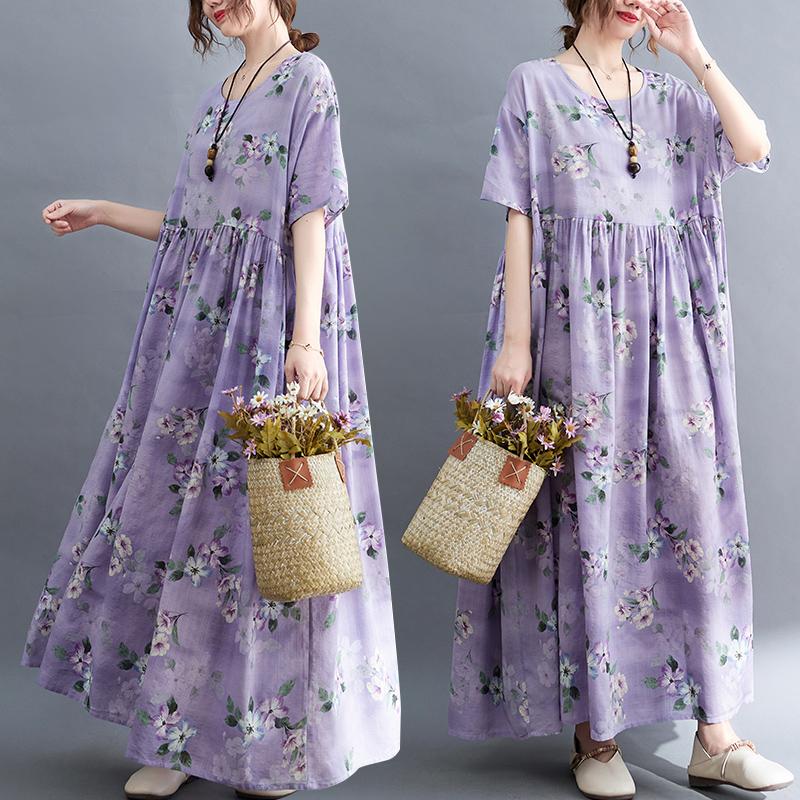 DIMANAF льняное летнее платье больших размеров, пляжный сарафан, повседневная фиолетовая женская одежда с цветочным принтом One Size фиолетовый
