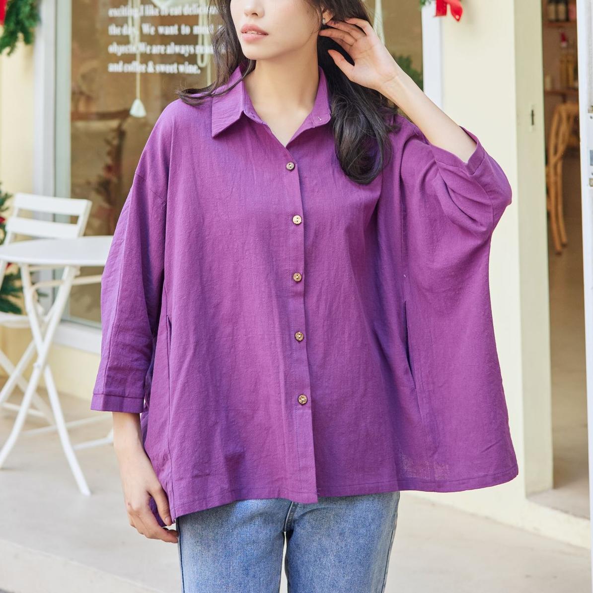 DIMANAF плюс размер, лето 2024, новая женская футболка «летучая мышь», однотонная льняная блузка с пуговицами, топы, льняная рубашка, свободные новые футболки в стиле ретро, фиолетовые One Size