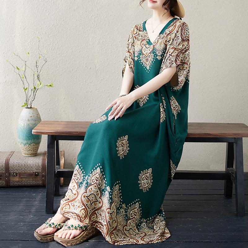 DIMANAF 2024 Платье Большого Размера Летнее Женское Винтажный Стиль Принт V-образный вырез Праздничное Бохо Короткий рукав Свободное Новое Длинное Платье One Size зелёный