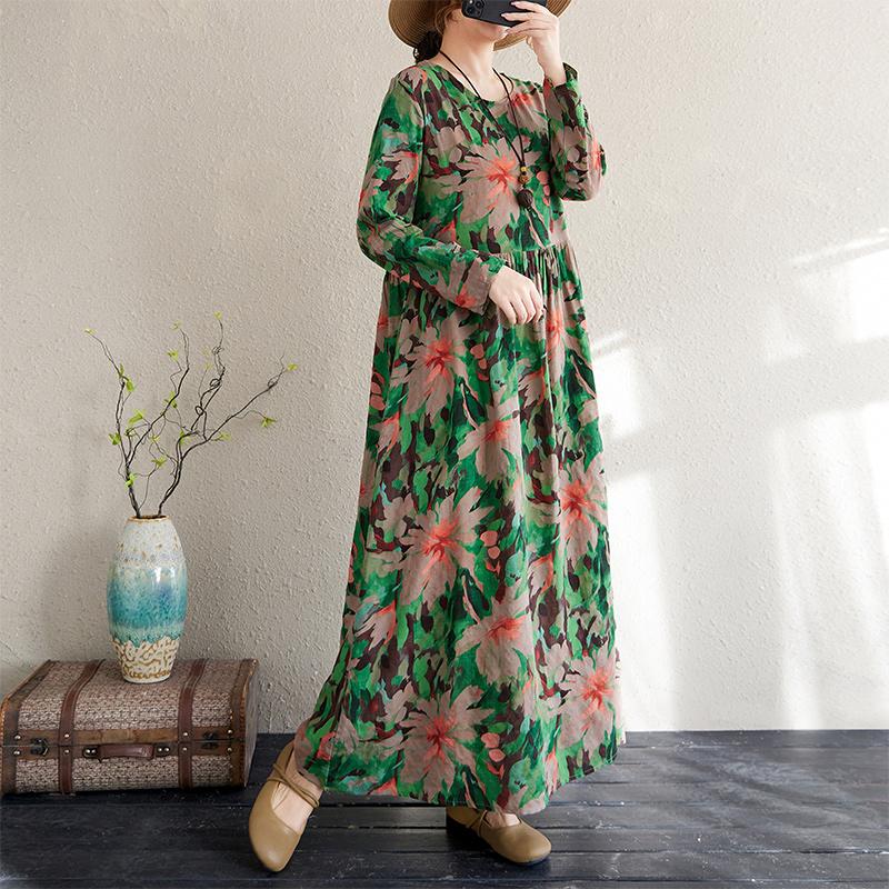 DIMANAF 2025 Женское Новое Весеннее Длинное Платье Плюс Размер Длинный Рукав О-Образный Вырез Цветочный Принт Свободный Повседневный Винтаж Макси 2XL зелёный