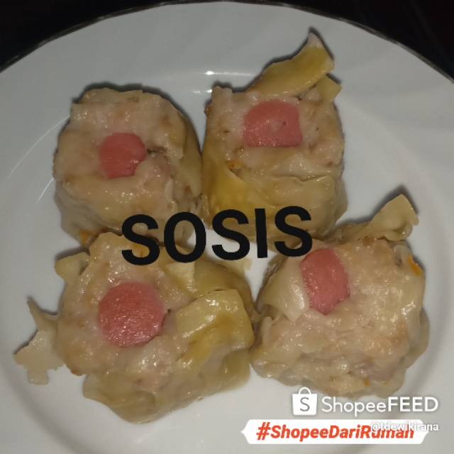 Terbuat dari daging ayam dengan toping sosi isi 4 yang di balut dengan kulit pangsit dan minyak wijen