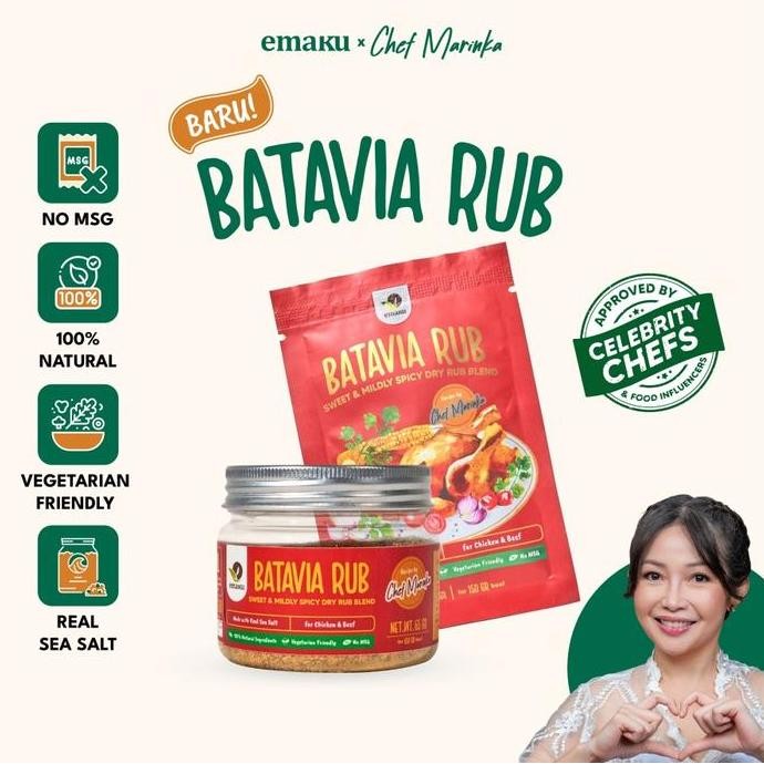Batavia Rub merupakan resep rahasia Chef Marinka berupa paduan bumbu dengan cita rasa manis dan sedikit pedas yang terbuat dari 100% bahan premium alami dan Real Sea Salt. Selain itu, produk ini juga vegetarian friendly, tanpa MSG, tanpa bahan pengawet dan tanpa bahan pewarna. Penggunaan terbaik sebagai bumbu marinasi pada daging sapi dan ayam.