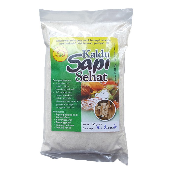Kaldu Sehat bermerek dagang Sun V berupa bubuk dengan rasa sapi dengan kemasan plastik 200gram. Daya tahan dan perlakuan perawatan kaldu/ bumbu masak ini sama seperti bumbu masak yang lain.