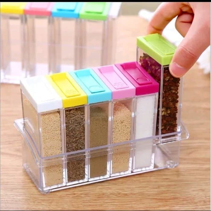 Tempat bumbu unik, 1 set terdiri dari 6 botol bumbu dan 1 holder. Tiap botol bumbu berbentuk transparan, memudahkan melihat dan membedakan jenis bumbu, masak jadi lebih cepat, gak pakai lama akibat kelamaan nyari bumbu yang lupa di selip dimana. Bumbu dapur ada aneka macam, anda pasti sering lupa dimana menyimpan bumbu dapur yang kemasannya kecil-kecil, kadang diselip di pojok lemari atau kulkas, pas lagi mau masak nyarinya sampai lama gak nemu-nemu juga. Mau beli ke pasar sudah kesorean, pasar sudah tutup, batal deh masaknya. Nah dengan 6 in 1 tempat bumbu ini, bumbu dapur anda jadi tersimpan rapi di meja dapur. Saat butuh tinggal ambil dan tuang, masak jadi mudah dan praktis. Tutupnya sangat rapat, untuk tuang cukup tekan ke bawah clip penutup botol bumbu. Mulut tutup botol terdapat 2 jenis mulut berbeda : - 3 botol dengan mulut botol diameter lobang 1 cm untuk jenis bumbu berbentuk biji-bijian seperti biji lada dan sejenisnya. - 3 botol dengan mulut 7 lobang kecil untuk tempat bumbu jenis bubuk Material : Food grade plastick Size : 18.3 x 6.2 x 10.5 cm Barang kami selalu ready ya kak bila ada di etalase