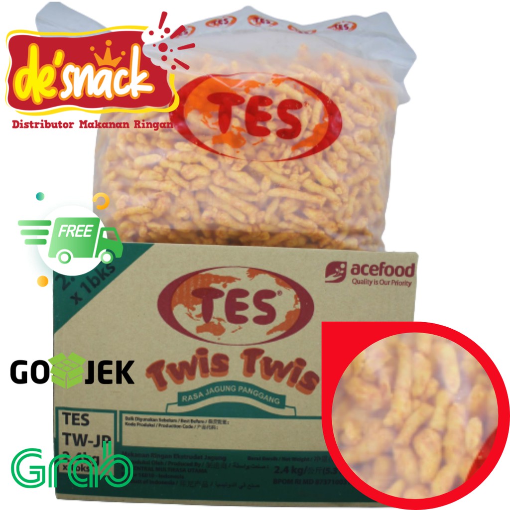Snack/Cemilan/Twist Twist Rasa Jagung Bakar Merek TES dengan kemasan 2,4 Kg dijual dengan harga grosir pabrik yang dapat dijual lagi dengan keuntungan yang menarik, bisa dikemas lagi dengan ukuran dan merek sendiri