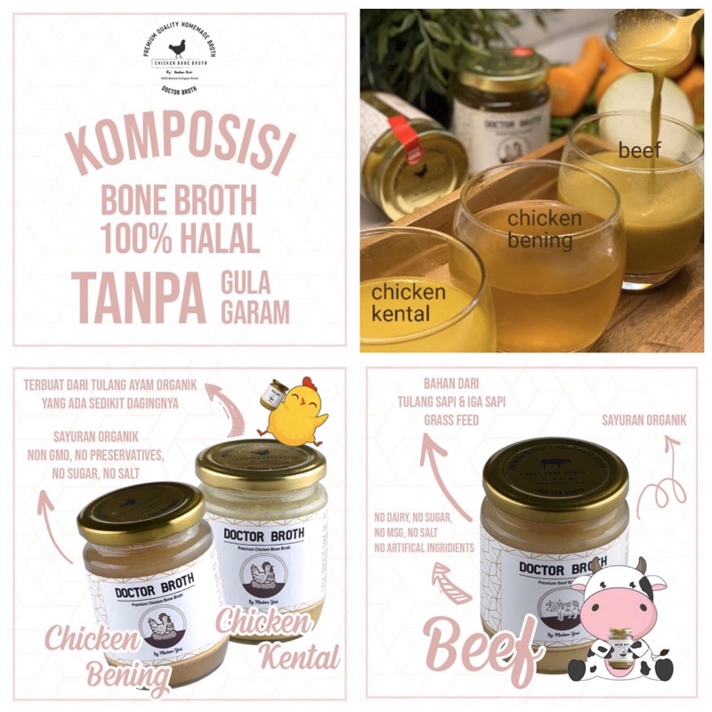 DOCTOR BROTH Chicken, Beef dan Fish Bone Broth. Ukuran jar 250ml isi 210ml.