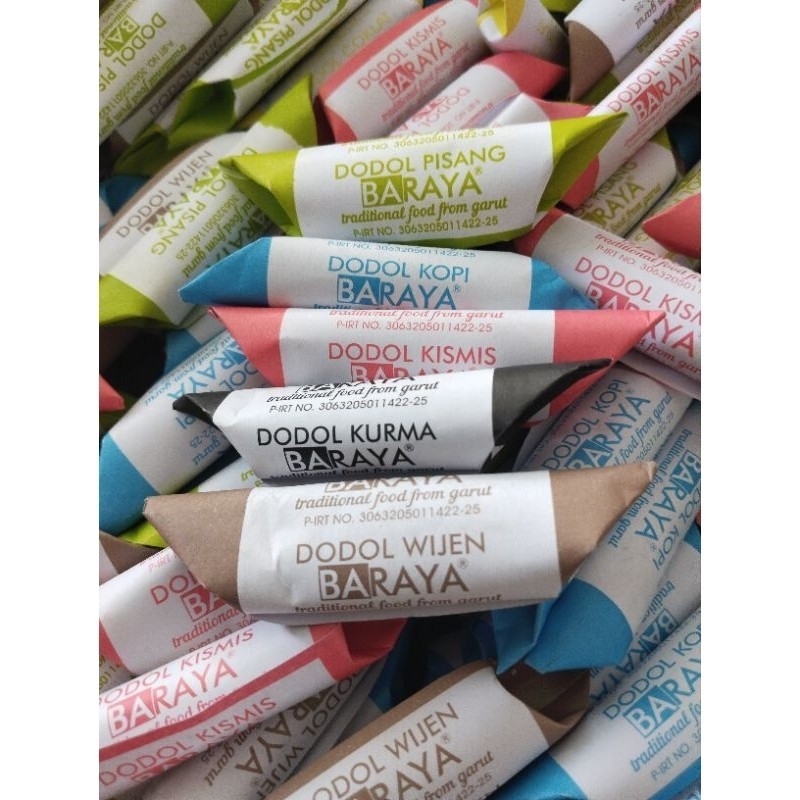 Dodol premium aneka rasa merk Baraya ada 6 varian rasa yaitu rasa kopi, kurma, wijen, kismis, pisang, dan coklat. 1kg bMasa penyimpanan 3 bulan.