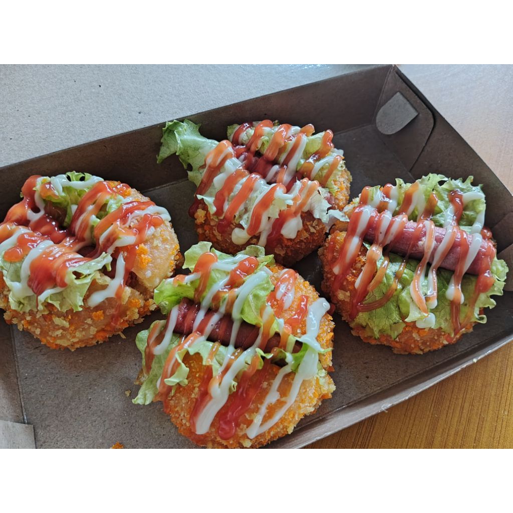 donat crispy dengan sosis dan sayur d tengahnya, d tambah saos Tomat dan mayonaise, membuat donat dg rasa yg unik dan lezat.