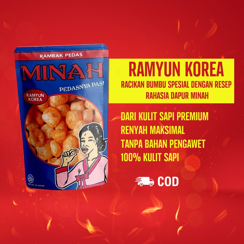 Dibuat dari kulit sapi pilihan kualitas PREMIUM , dipadukan dengan bumbu dan rempah rahasia dapur Minah, serta digoreng dengan suhu yang tepat menjadikan Rambak Pedas Minah begitu renyah dan nikmat.