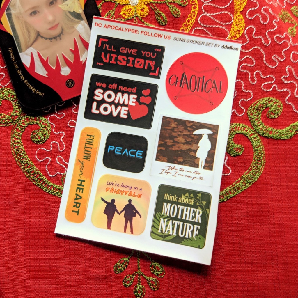 New sticker set from Dreamcatcher's Apocalypse: Folllow Us, second part of the ongoing trilogy. From Chaotical X to Fairytale to Mother Nature, there's 8 mini stickers you can use to decorate your beloved items. Enjoy, InSomnia!