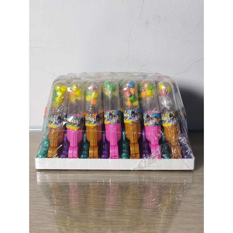 permen aneka rasa buah dengan kemasan berbentuk pistol peluit bisa di tiup
