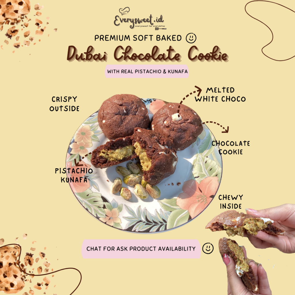 Nikmati sensasi mewah dari setiap gigitan Dubai Chocolate Cookies, kombinasi sempurna antara cokelat premium, renyahnya pistachio, dan tekstur unik kunafa yang menggoda.