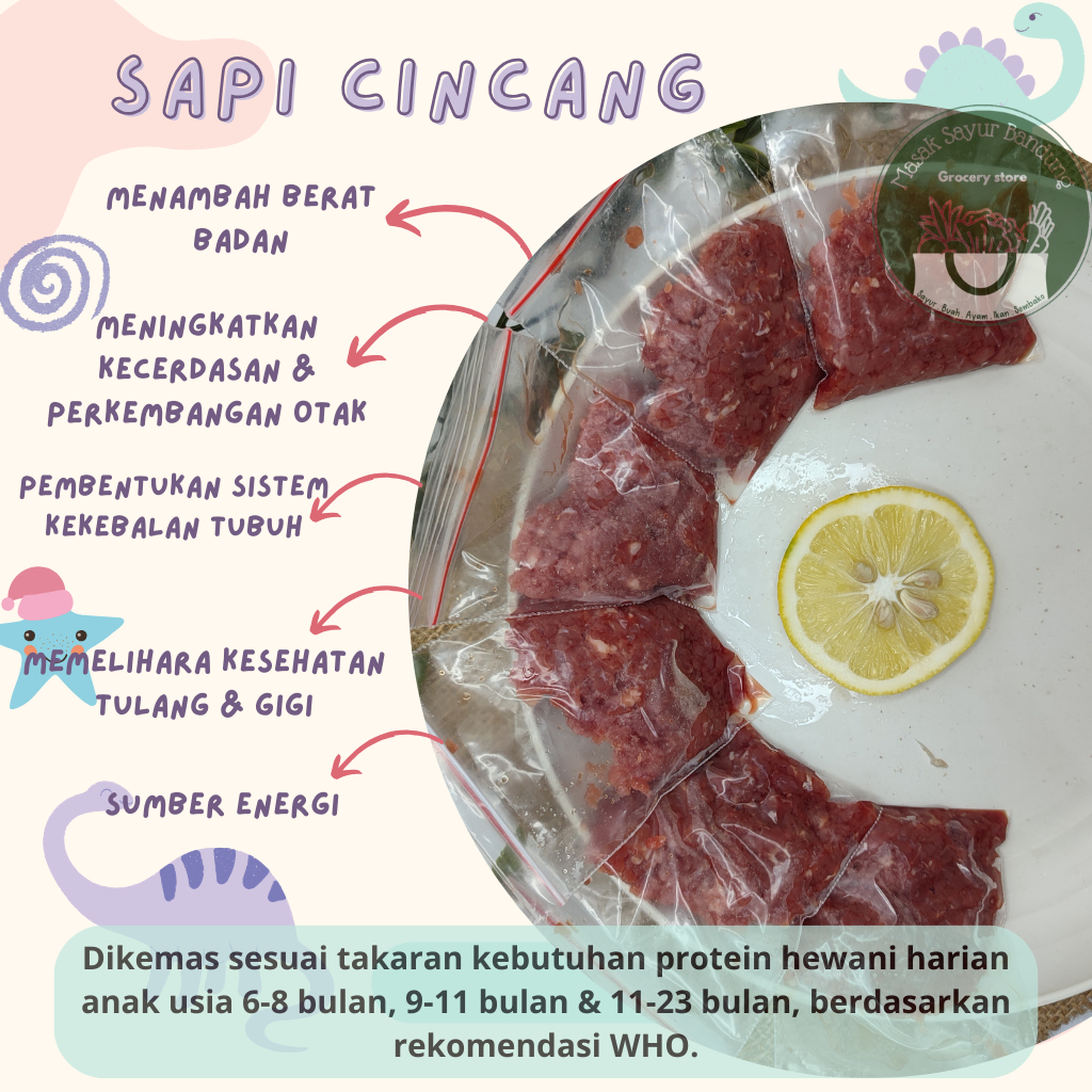 “Daging sapi termasuk asupan tinggi protein dan mengandung zat besi serta lemak yang dapat mendorong pertumbuhan bayi dengan cepat..”