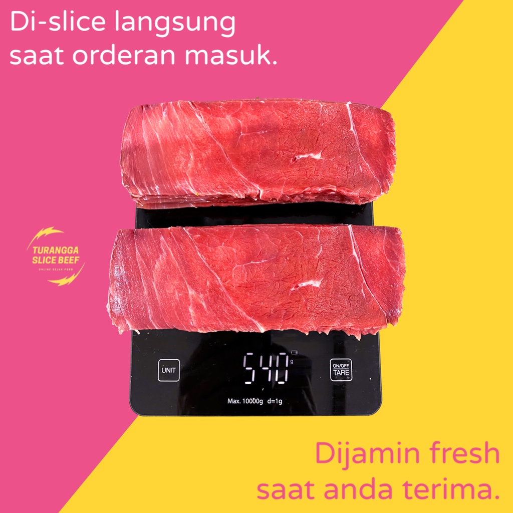 Slice Beef Sirloin/Topside tanpa lemak kemasan 500 gr, siap untuk Shabu-shabu, Sukiyaki, Yakiniku.
