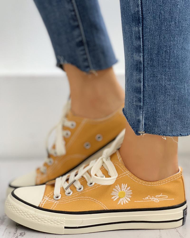Daisy Pattern Eyelet Lace-up Sneakers, Yellow