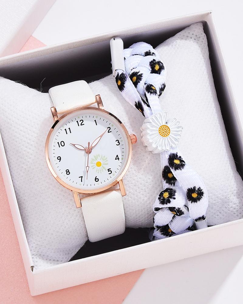 Daisy Pattern Pointer Quartz Watch & Bracelet Set, White