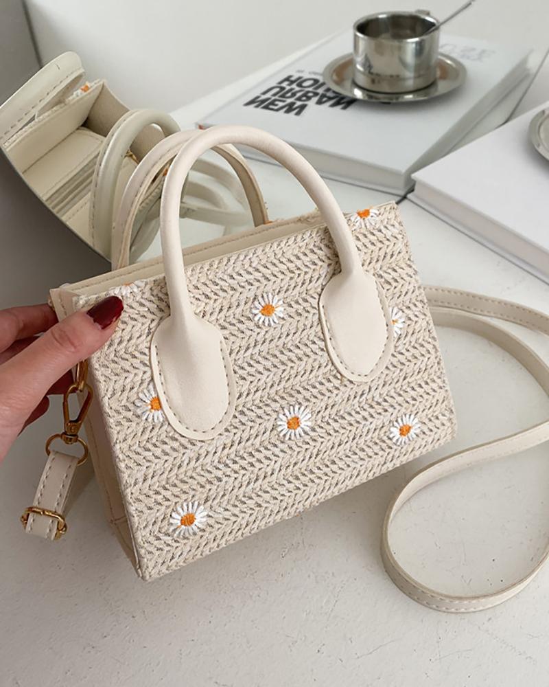 Daisy Pattern Straw Woven Beach Messenger Bag, White