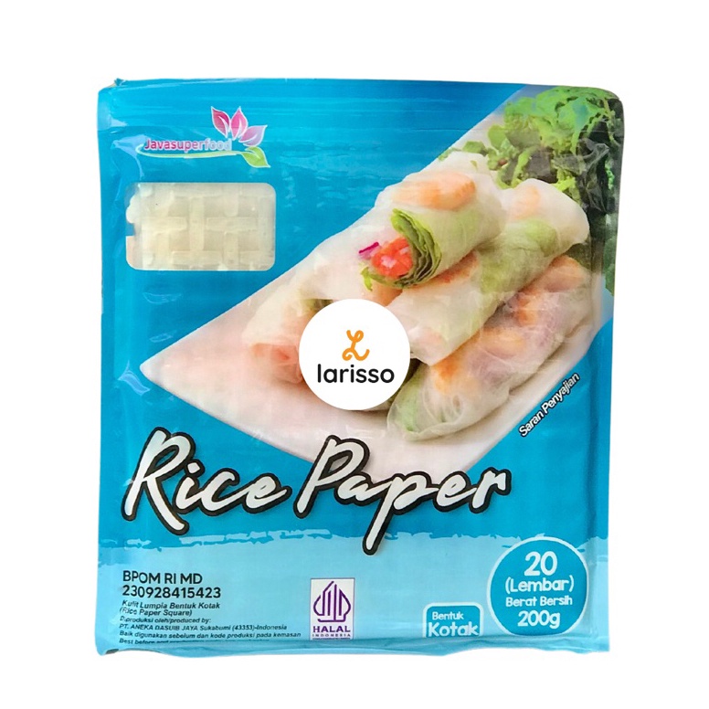 Java Super Food Rice Paper adalah sejenis kulit lumpia yang dibuat dari tepung beras. Rice Paper digunakan setelah dicelupkan/diolesi dengan air matang hingga lembek. Rice Paper dapat dibuat menjadi spring roll dengan isian sayuran segar, ayam, udang, ikan, atau daging. Atau bisa juga dibuat menjadi spring roll dengan isian manis, seperti buah segar, kacang-kacangan, dengan saus selai buah, madu, atau yogurt.
