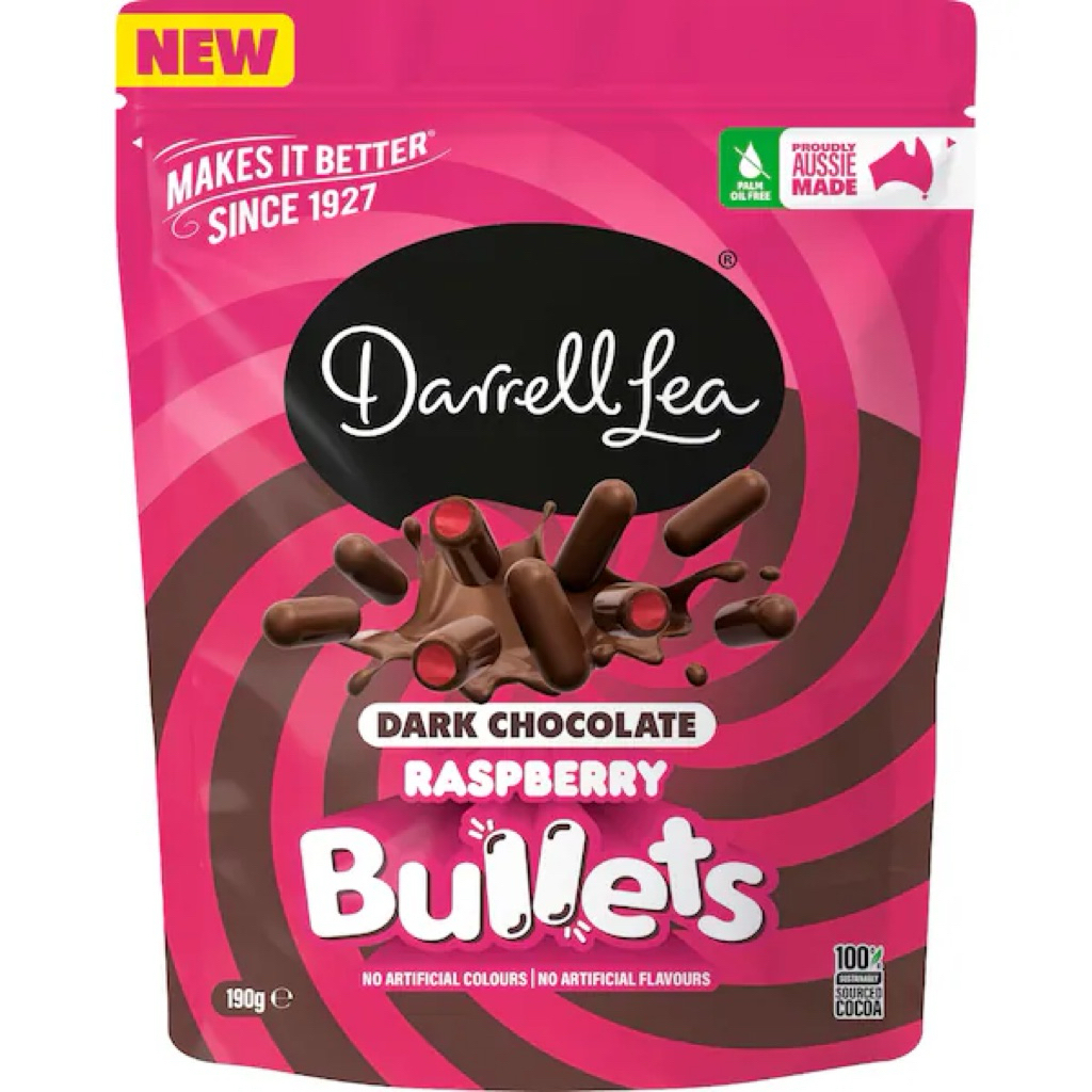 Darrell Lea's Dark Chocolate Raspberry Bullets combine chewy raspberry-flavoured centres with a layer of luxurious dark chocolate for a delightful blend of rich, fruity flavours. A treat to savour anytime, anywhere!