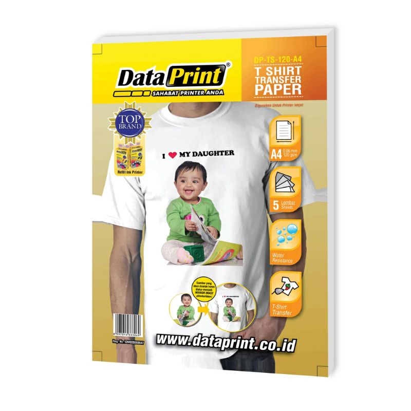 Dataprint T-shirt Transfer Paper adalah Kertas yang digunakan untuk mengaplikasikan gambar atau foto ke permukaan kaos. Juga dapat diaplikasikan pada bahan kaos & polo shirt juga tas berbahan kanvas & blacu yang berwarna cerah. Hasil cetak akan lebih terlihat halus dan tajam dengan resolusi tinggi. Kertas ini tahan terhadap air sehingga tidak mudah luntur. Sekarang kamu bisa mendesain dan membuat baju juga totebag dengan gambar yang sesuai keinginan kamu.