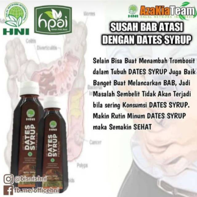 Dates Syrup Premium HNI merupakan salah satu suplemen makanan terbaik yang mengandung berbagai zat aktif yang sangat baik bagi tubuh sekaligus menjadi sumber energi yang kaya akan kalori, vitamin, mineral dan serat.