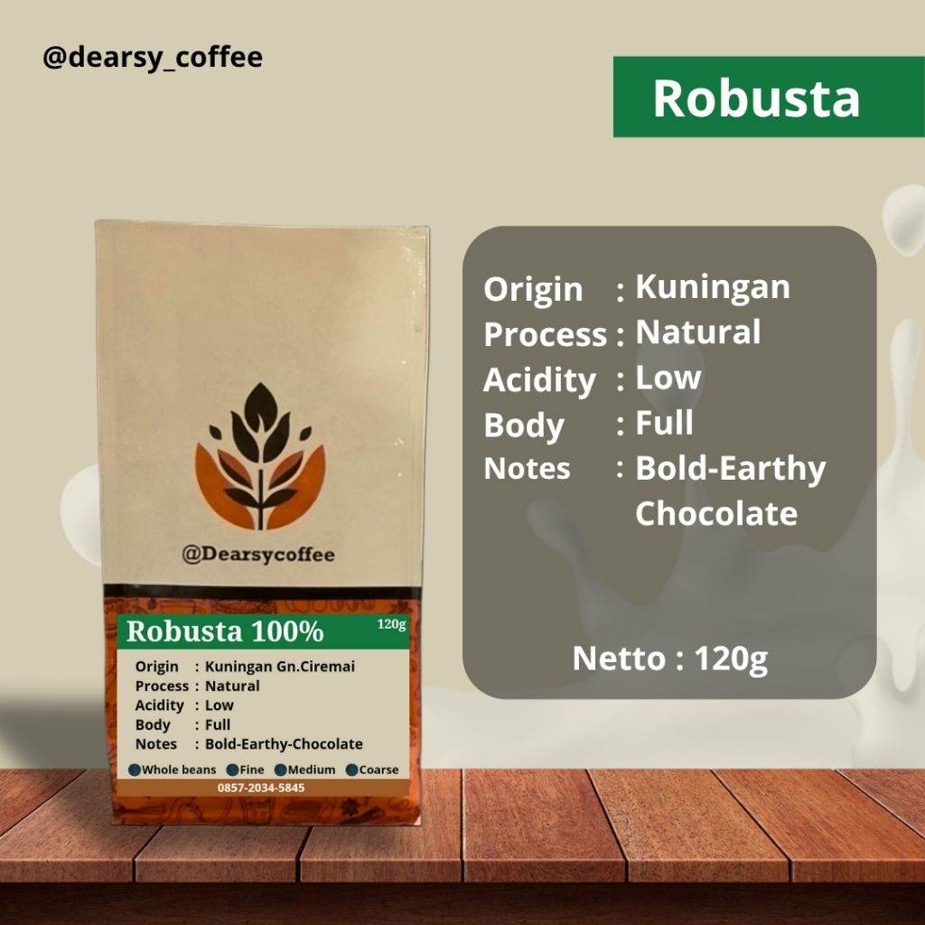 Robusta khas Kuningan dengan proses natural ini menghadirkan sensasi kopi yang tebal, kuat, dan earthy. Karakter bold dengan rasa cokelat pahit alami menjadikannya pilihan mantap untuk kamu yang menyukai kopi hitam pekat atau espresso lokal yang bertenaga.
