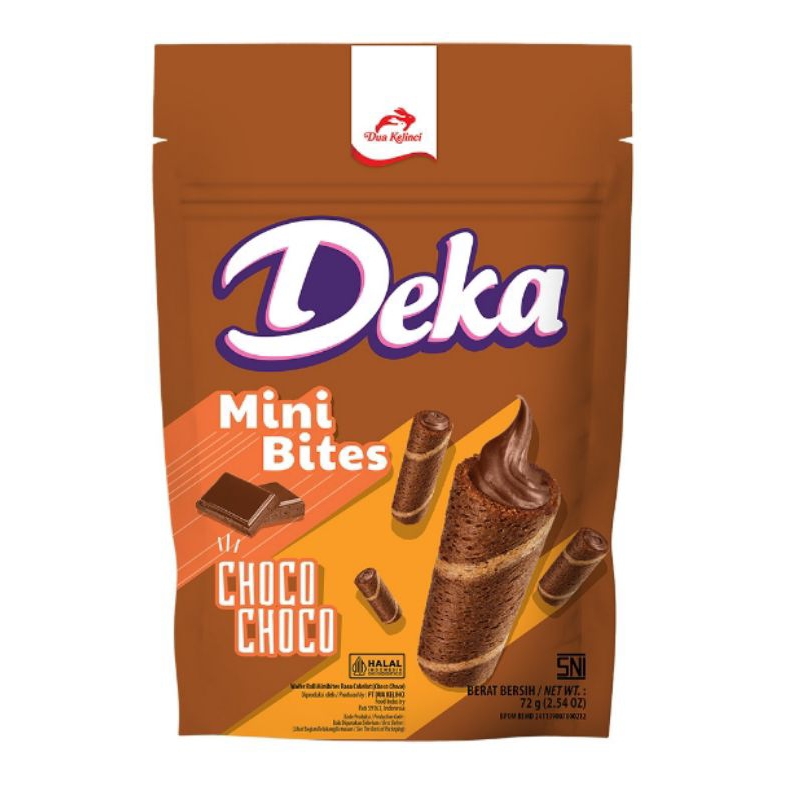 Deka Mini Wafer Bites Choco 72 g adalah sebuah snack wafer rasa cokelat. Dibuat menggunakan bahan bahan pilihan dan berkualitas, yang diolah secara higienis menggunakan teknologi tiggi. Wafer berbentuk tabung mini dengan isian berupa krim manis rasa cokelat. Memiliki teksur kulit yang renyah dan manis dengan isian krim cokelat manis dan tekstur creamy yang khas. Dibentuk dengan cara digulung membentuk stick berukuran kecil, sehingga pas dalam sekali lahapan. Dikemas dalam kemasan kantung standing pouch yang dilengkapi dengan fitur resealable zip lock, sehingga rasa dan kualitas snack dapat terjaga. Cocok dijadikan cemilan ringan saat bersantai atau saat sedang ngopi atau ngeteh. Segera miliki dan rasakan kenikmatan snack rasa cokelat pada Deka Mini Wafer Bites Choco 72 g