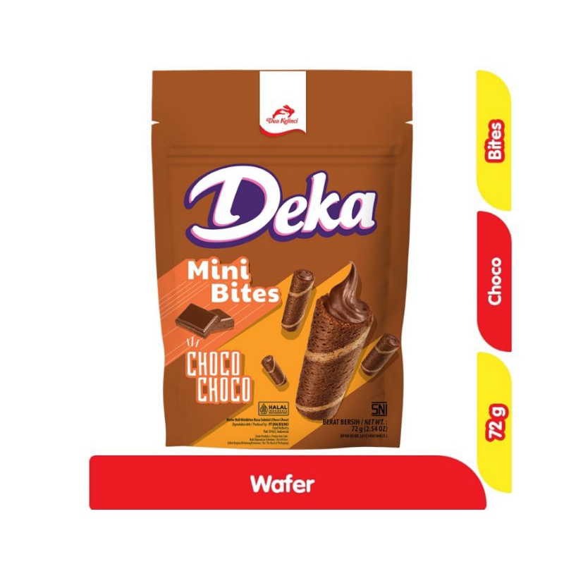 Deka Mini Wafer Bites Choco 72 g adalah sebuah snack wafer rasa cokelat. Dibuat menggunakan bahan bahan pilihan dan berkualitas, yang diolah secara higienis menggunakan teknologi tiggi. Wafer berbentuk tabung mini dengan isian berupa krim manis rasa cokelat. Memiliki teksur kulit yang renyah dan manis dengan isian krim cokelat manis dan tekstur creamy yang khas. Dibentuk dengan cara digulung membentuk stick berukuran kecil, sehingga pas dalam sekali lahapan. Dikemas dalam kemasan kantung standing pouch yang dilengkapi dengan fitur resealable zip lock, sehingga rasa dan kualitas snack dapat terjaga. Cocok dijadikan cemilan ringan saat bersantai atau saat sedang ngopi atau ngeteh. Segera miliki dan rasakan kenikmatan snack rasa cokelat pada Deka Mini Wafer Bites Choco 72 g