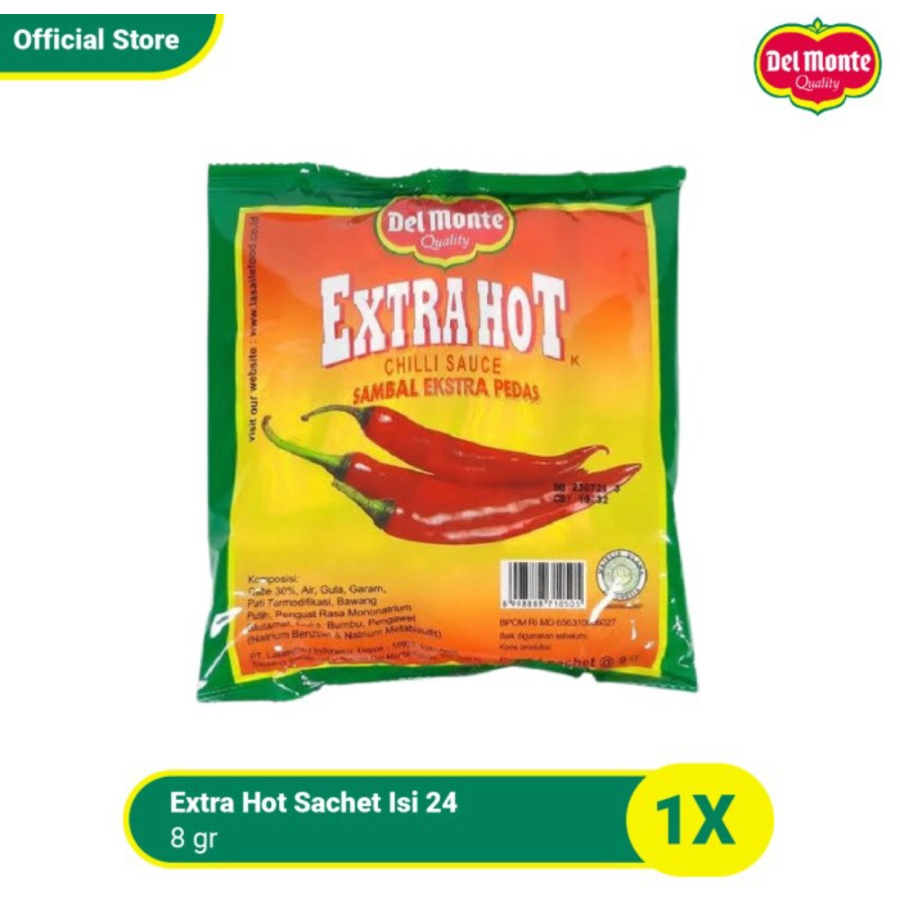 Delmonte Extra Hot 24 x 8 g Merupakan Saus cabe dengan rasa pedas yang pas, sangat cocok untuk teman aneka menu dan hidangan keluarga serta perjalanan anda. Delmonte Extra Hot Sachet Harga utk 1 pak isi 24x8 gr Chili Sauce Saos Cabe Sambal