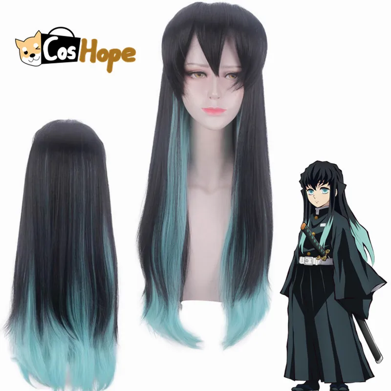 Demon Slayer Tokitou Muichirou Wig Kimetsu no Yaiba Cosplay Anime Synthetic Wigs Long Black Gradient Mint Wig Halloween