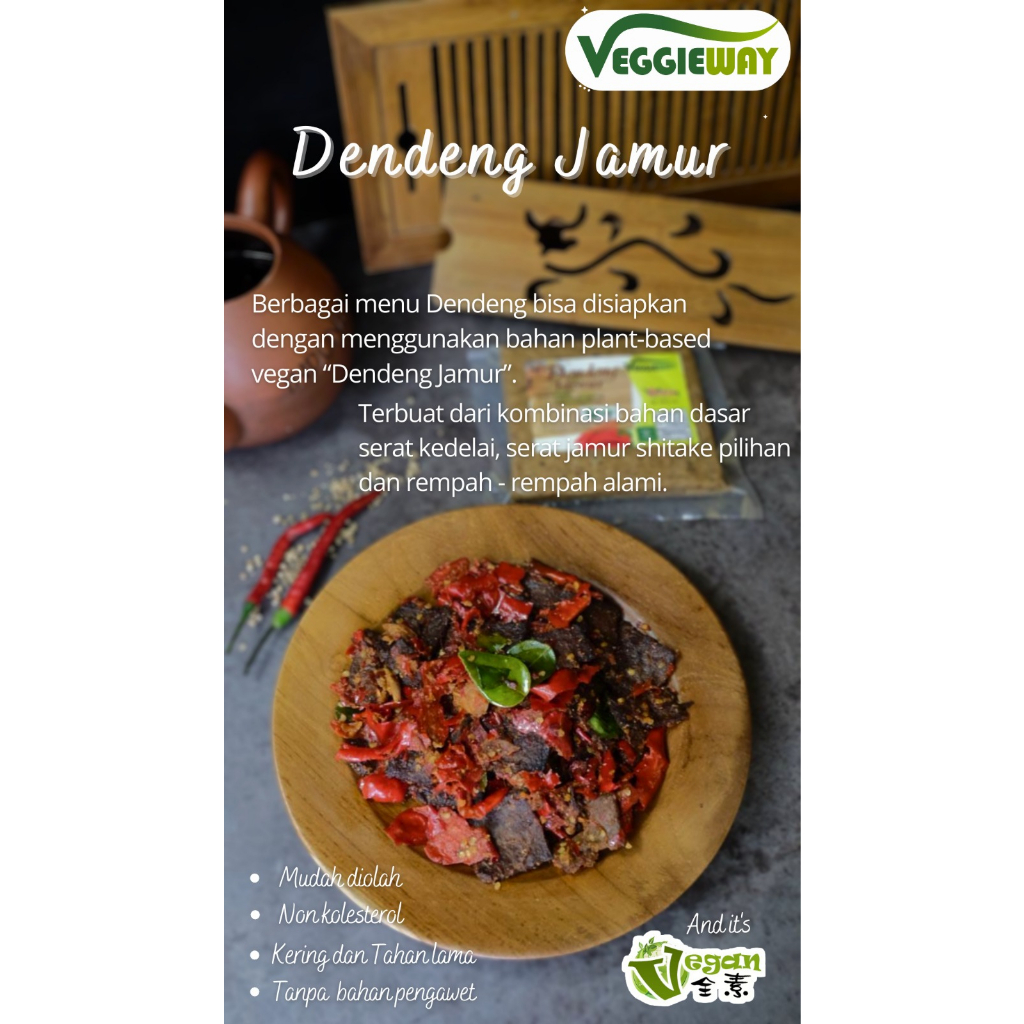 Dendeng Jamur dari Veggieway, tentu saja non daging :) adalah dibuat dari kombinasi bahan dasar serat kedelai dan serat jamur shitake.