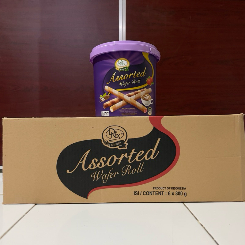 Satu karton Denex Assorted Wafer Roll 300 gr berisikian 6 timba.