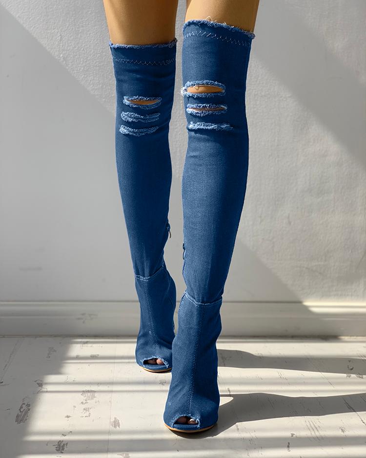 Denim Knee-High Zipper Ripped Open Toes Boots, Blue