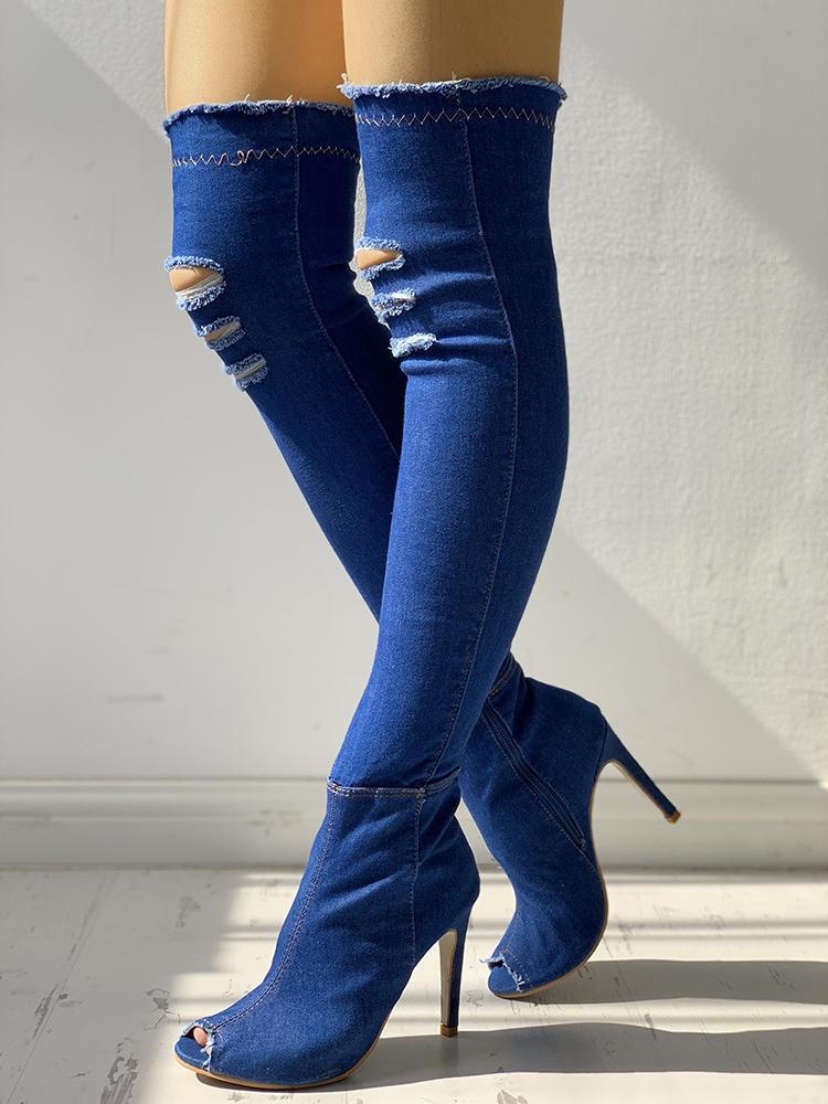 Denim Knee-High Zipper Ripped Open Toes Boots