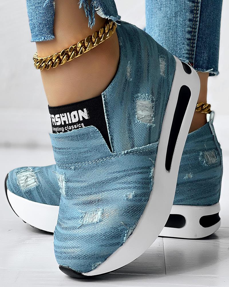 Denim Ripped Platform Slip-On Muffin Sneakers, Light blue