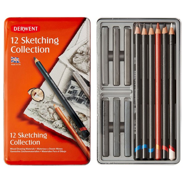 Tin Contents: 3 Watersoluble Sketching pencils, 3 Charcoal pencils, 2 Drawing pencils, 1 Pastel pencil, 3 Natural graphite (blocks) and 3 Compressed Charcoal (blocks).