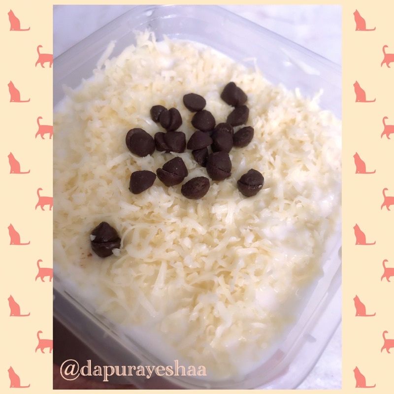 Deser box berisikan setup roti yang dicampur vannila dan susu ditaburi keju yang melimpah dan diberi chocochip