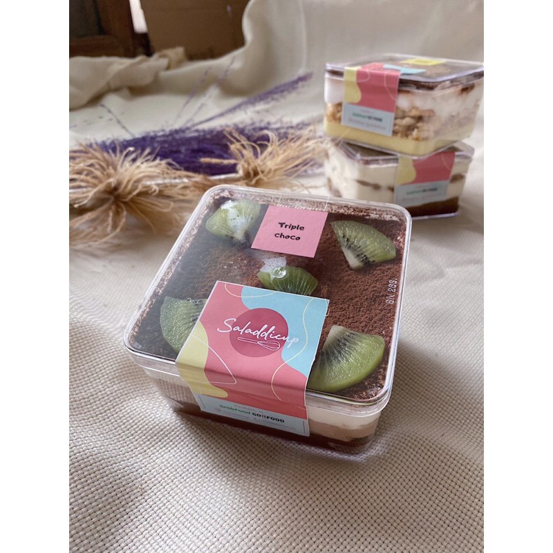 Terdiri dari 3 lapisan chocolate . Yaitu dark choco pannacota, milk choco dan white choco atasnya taburan cocoa powder dan toping kiwi atau stroberi. ukuran box 11x11x6 cm