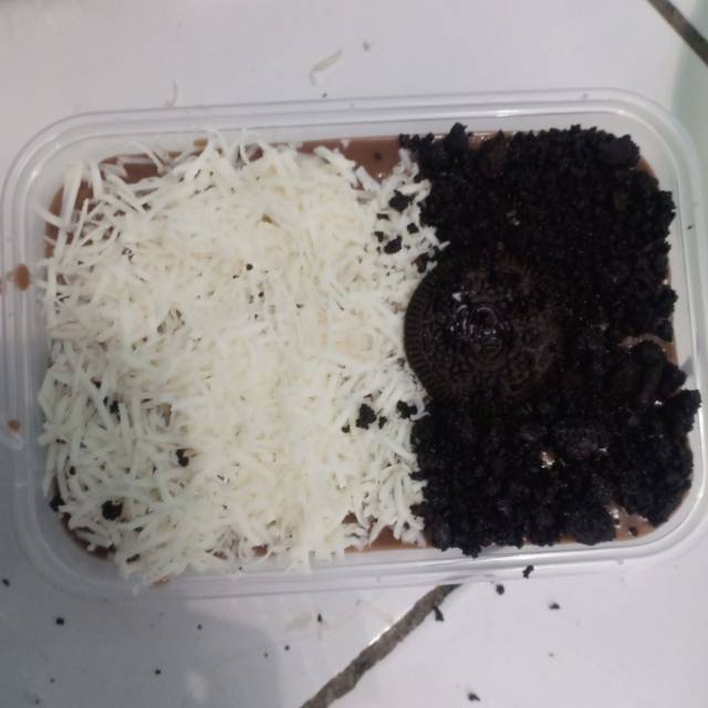 Isi desert oreo bawah nya oreo , tengah saos vanila keju , atas coklat toping ada keju , oreo , milo